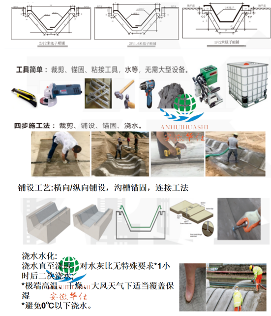 混凝土毯使用極為簡(jiǎn)單:打開(kāi)卷材、切割、鋪設(shè)、固定、澆水。澆水24小時(shí)后,混凝土毯抗折強(qiáng)度可高達(dá)10MPa以上。增強(qiáng)纖維可增強(qiáng)韌性,防止開(kāi)裂,并且使整個(gè)材料結(jié)構(gòu)有極強(qiáng)的整體性,抵御極強(qiáng)的變形沖擊,機(jī)械壽命長(zhǎng)。